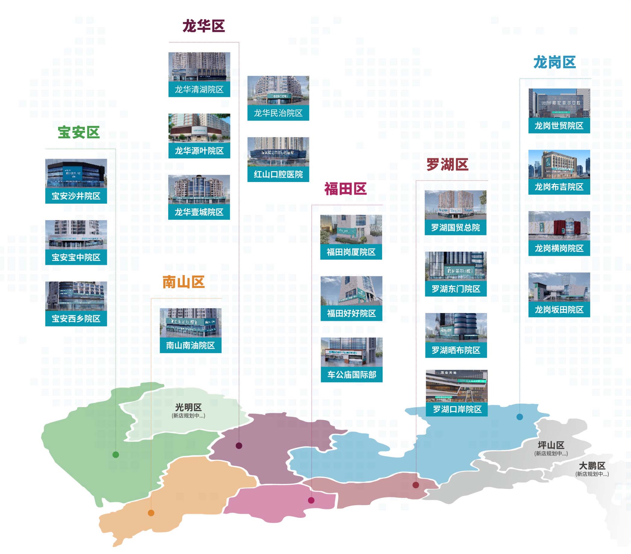 在深圳拥有29家口腔门诊,其中2家综合性口腔医院,总配置800+台牙椅。院区覆盖罗湖、福田、南山、龙华、龙岗、宝安六个大区。在罗湖口岸、福田口岸及深圳北站等深港交通枢纽点均有分院。